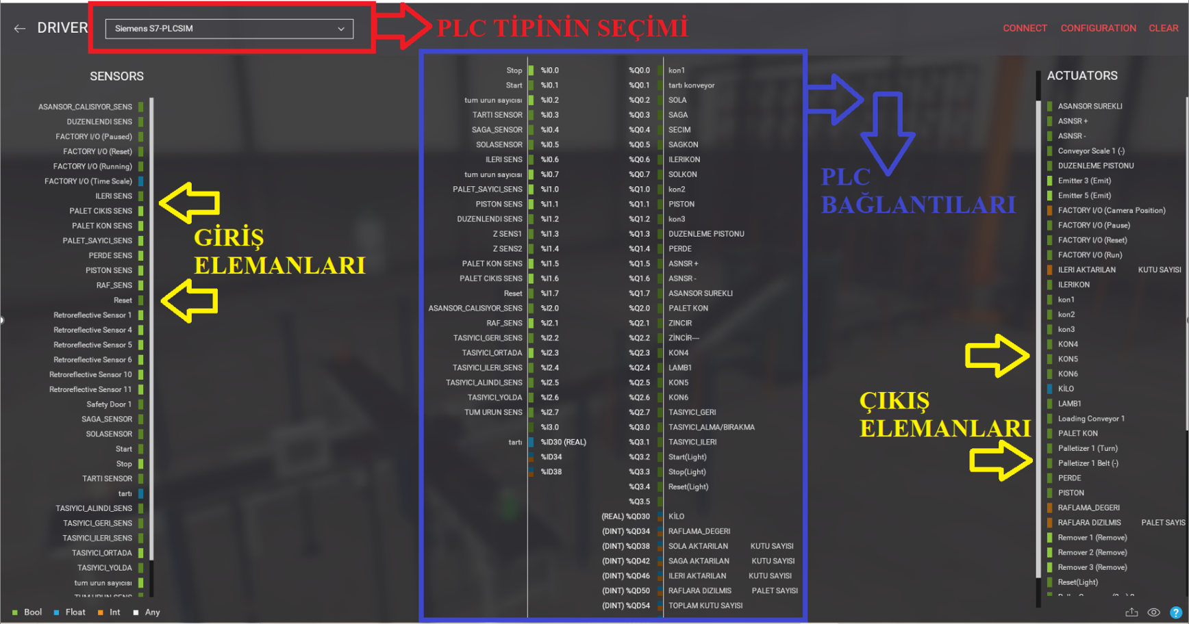 ➤ In the images above you can see the project design, the names of the connections and the Factory-io driver menu in detail.