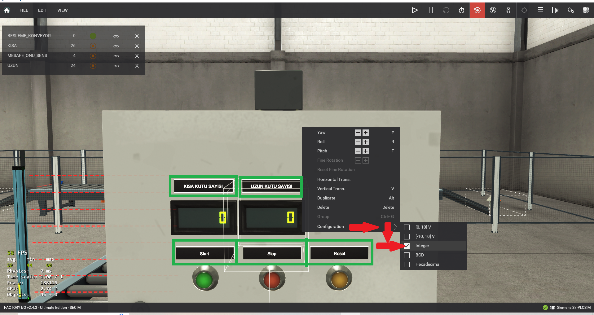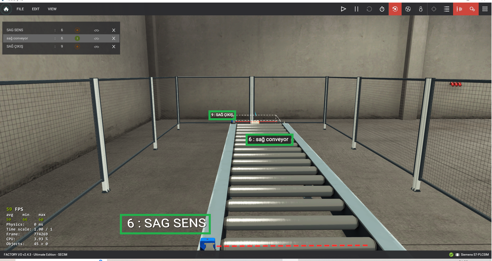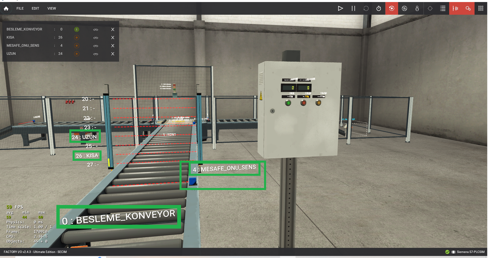 • The project begins with a light barrier at the beginning of the conveyor. This light barrier detects the height of the box passing over it. Depending on the box's height, it is classified as long or short.