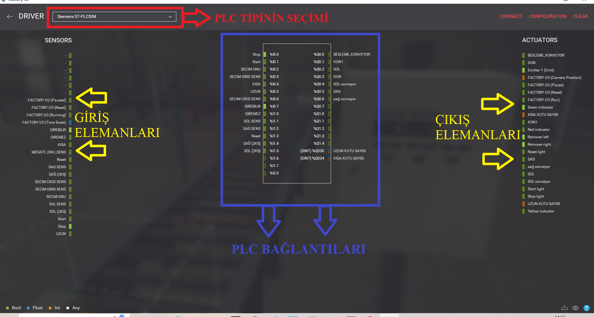 ➤ In the images above you can see the project design, the names of the connections and the Factory-io driver menu in detail.
